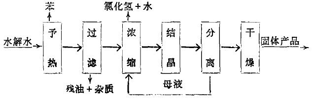 工藝說明:水解水首先予熱至沸騰。然后,將予熱后溶液過濾(采用真空過濾)除去溶液中殘油及其它雜質。過濾后溶液濃縮至溶液表面有晶膜出現便停止加熱(濃縮終點溫度為124℃,粗測),使共自然結晶。將結晶體與母液分離(離心分離或真空抽濾),母液送回再次濃縮,固體包裝后即為結晶三氯化鋁產品。或將濃縮結晶后的固體產品經與液液分離后,通入熱風進行干燥處理,包裝后即為產品。