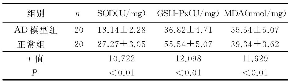 與正常組對應的3個指標比較, AD模型組SOD、GSH-Px活性明顯降低, 而MDA含量明顯升高。詳見表1。