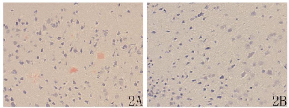 剛果紅染色, AD模型組海馬CA2區細胞外可見多個Aβ斑, 染成淡紅色, 在其周圍可能有浸潤的膠質細胞及變性神經細胞染成藍色, 背景清晰 (圖2A) ;而正常組錐體細胞結構清晰, 未見Aβ斑 (圖2B) 。