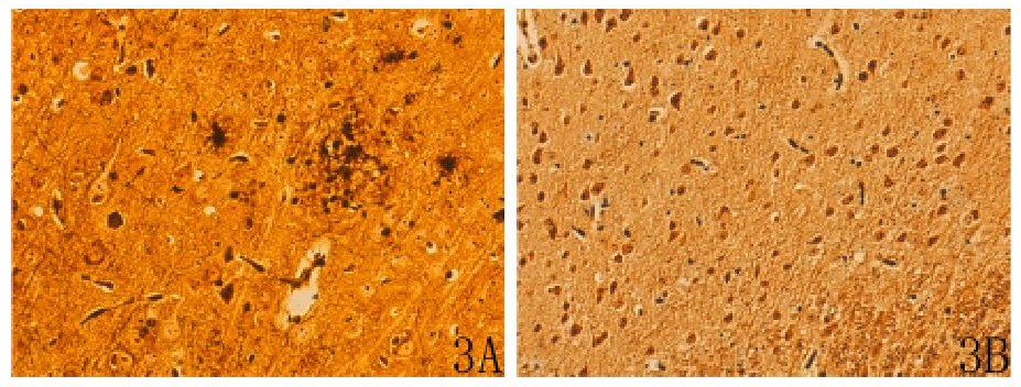 改良Bielschowsky氨銀液染色結果:AD模型組海馬CA2區可見錐體細胞排列不整齊、稀疏、萎縮、核固縮, 核周體內棕黑色細絲增粗、呈小塊狀;軸突內神經元纖維模糊不清;神經元外可見Aβ斑或老年斑, 體積較大、數量較多, 且周圍有浸潤的膠質細胞及變性的神經元 (圖3A) 。正常組海馬CA2區錐體細胞的細胞質內, 可清晰地看到棕黑色的細絲狀結構即神經原纖維, 在核周體內交織成網, 并伸入樹突和軸突;神經元外未見Aβ斑或老年斑 (圖3B) 。詳見圖3。