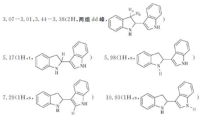 產物1b(3-(indolin-2-yl)- 1H-indole)1 H NMR(400MHz,DMSO-d6)δppm:10.93(s,1H),7.54(d,J =8.0Hz,1H),7.41(d,J=8.0Hz,1H),7.29(s,1H),7.13-7.06(m,2H),6.99-6.96(m,2H), 6.61-6.58(m,2H),5.98(s,1H),5.17(t,J=8.0Hz,1H),3.44-3.38(dd,J=8.0Hz,1H),3.07 -3.01(dd,J=8.0Hz,1H);13C NMR (100MHz,DMSO-d6)δppm:152.06,136.87,128.27,127.15, 125.71,124.22,122.10,121.13,119.32,118.36,118.24,116.90,111.59,108.12,55.85,37.42.